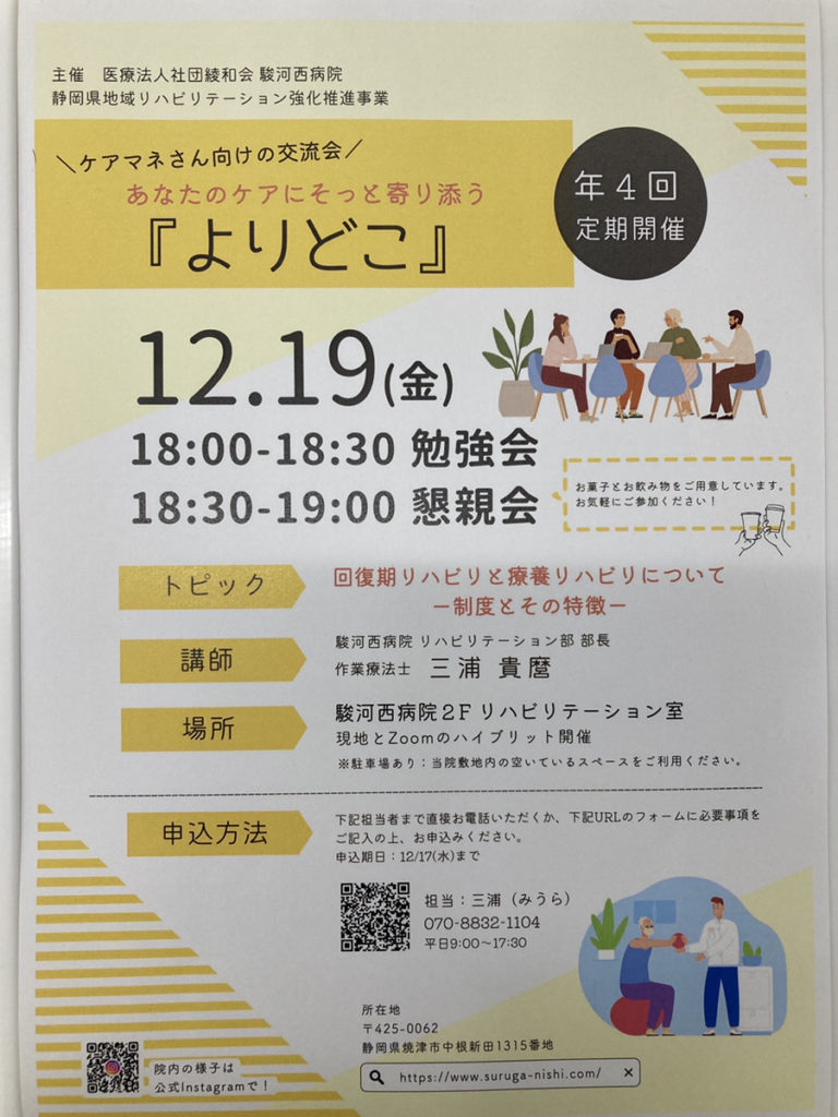 駿河西病院主催で、ケアマネさん向け交流会「よりどこ」(年4回定期開催)がスタートします!